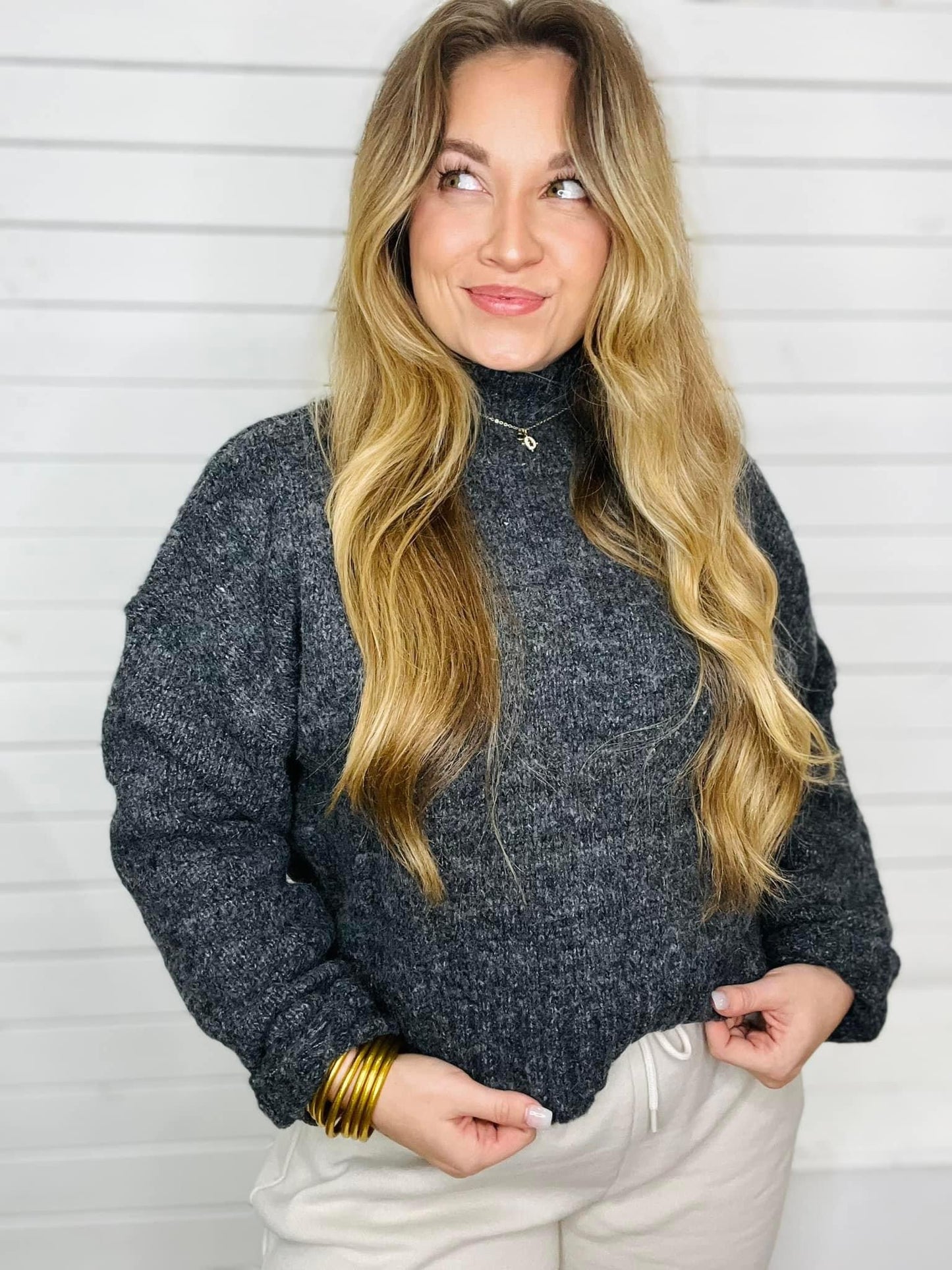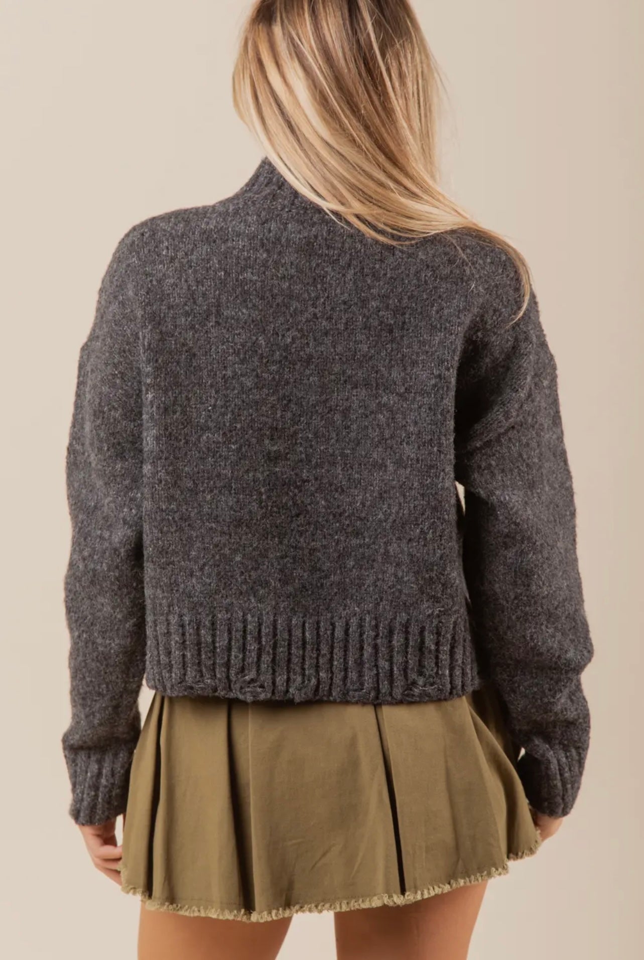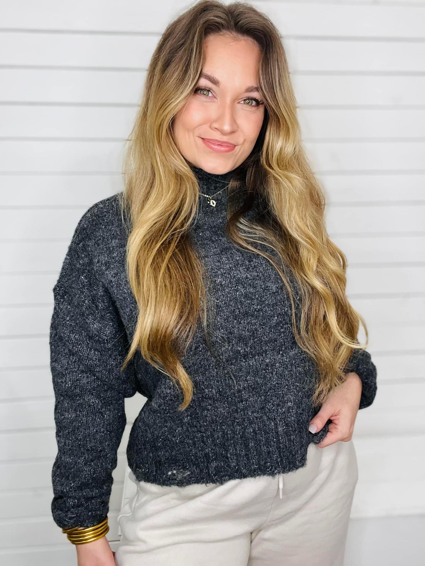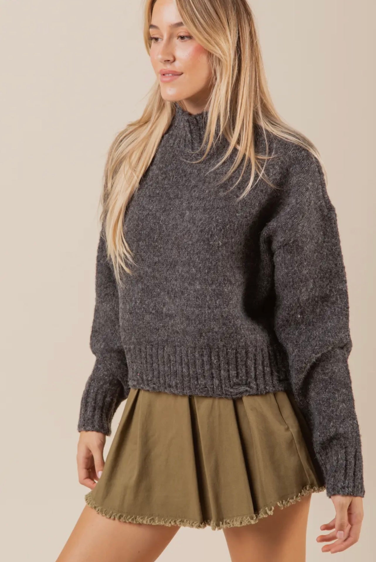 - Mock Neck Solid Cozy Sweater Top - Distressed Ribbed Hem Detail - Long Sleeve - Dropped Shoulder (Model height: 5'9", wearing a Small)
